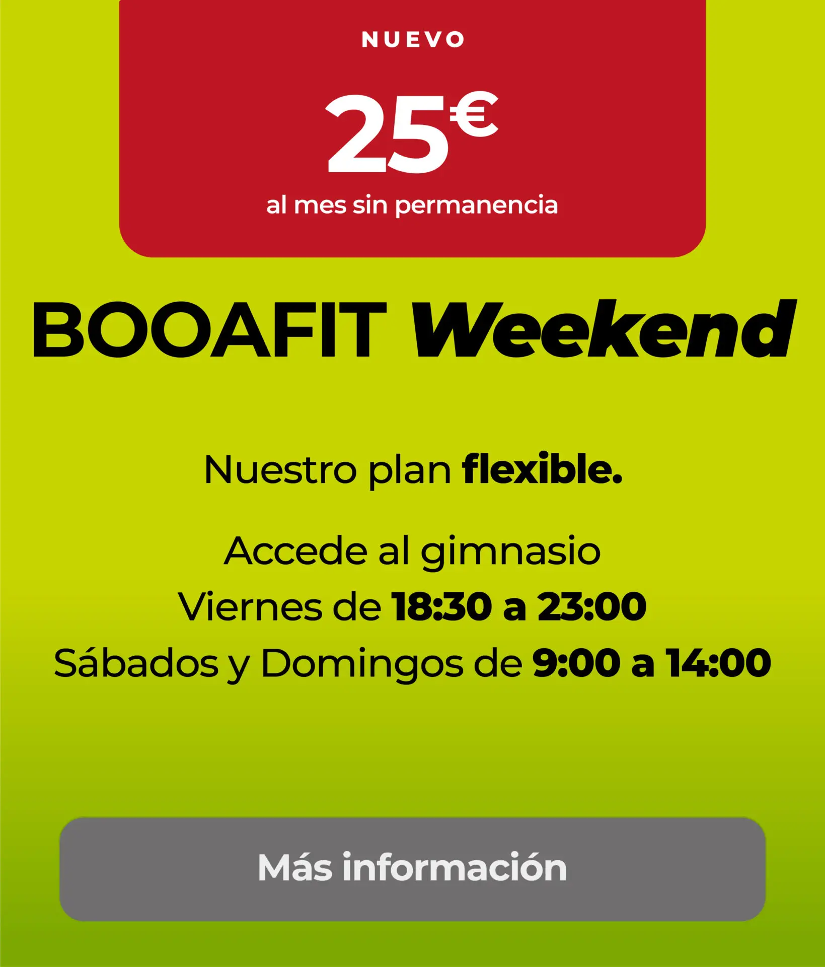- La matrícula es de sólo 25 euros, lo que convierte a BOOAFIT Weekend en la opción perfecta para mantenerte activo sin compromisos.